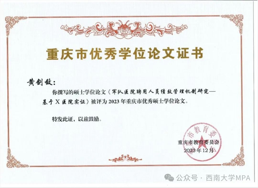 日前,重庆市教育委员会公布了2023年重庆市优秀硕士学位论文名单。我院2019级公共管理硕士研究生黄剑敌的毕业论文《军队医院聘用人员绩效管理机制研究—基于X医院实证》入选。