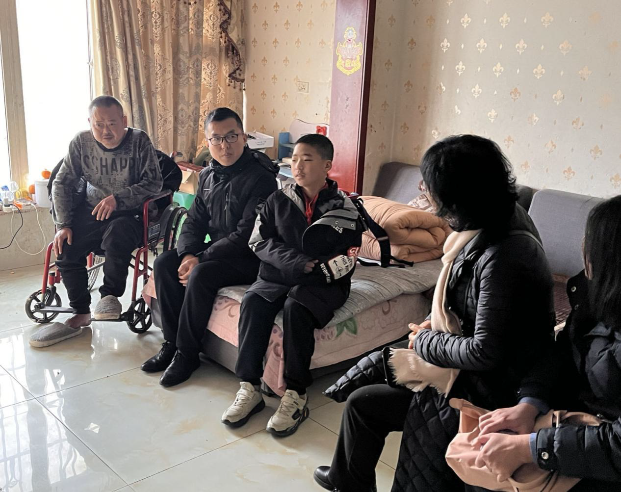 曾莉、蒋梓莹二位老师关切地询问了小黄同学日常的兴趣爱好、今后的理想等,对小黄同学上午在学校受赠仪式上的大胆发言进行了充分的肯定,鼓励其多阅读、积极参与活动加强锻炼,并诚挚邀请其到西南大学参观学习。同时,老师们还对小黄同学父亲的身体情况进行关心,聆听了黄父对其孩子成长的期待,并与小黄父亲、班主任共同探讨如何为孩子成长创造支持性的家庭环境,家长如何引导处于升学期的孩子、家庭与学校如何良好协作共同促进孩子健康成长等教育问题,为其解决困惑。