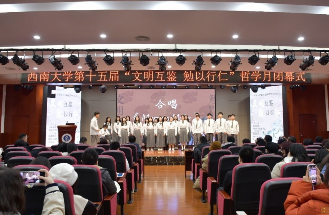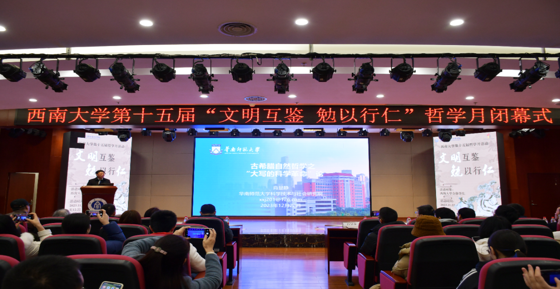 发布时间: 2023-12-25 17:15:16 已阅读:12月22日晚19:00,西南大学第十五届“文明互鉴·勉以行仁”哲学月闭幕式在校博物馆4楼报告厅隆重举行。华南师范大学特聘教授肖显静、校社科处副处长王作军、学生处助学中心主任孙金春、博物馆副馆长谭志敏、必赢线路检测中心副院长郭美云、张永红、何健以及全校师生200余人参加了闭幕式。