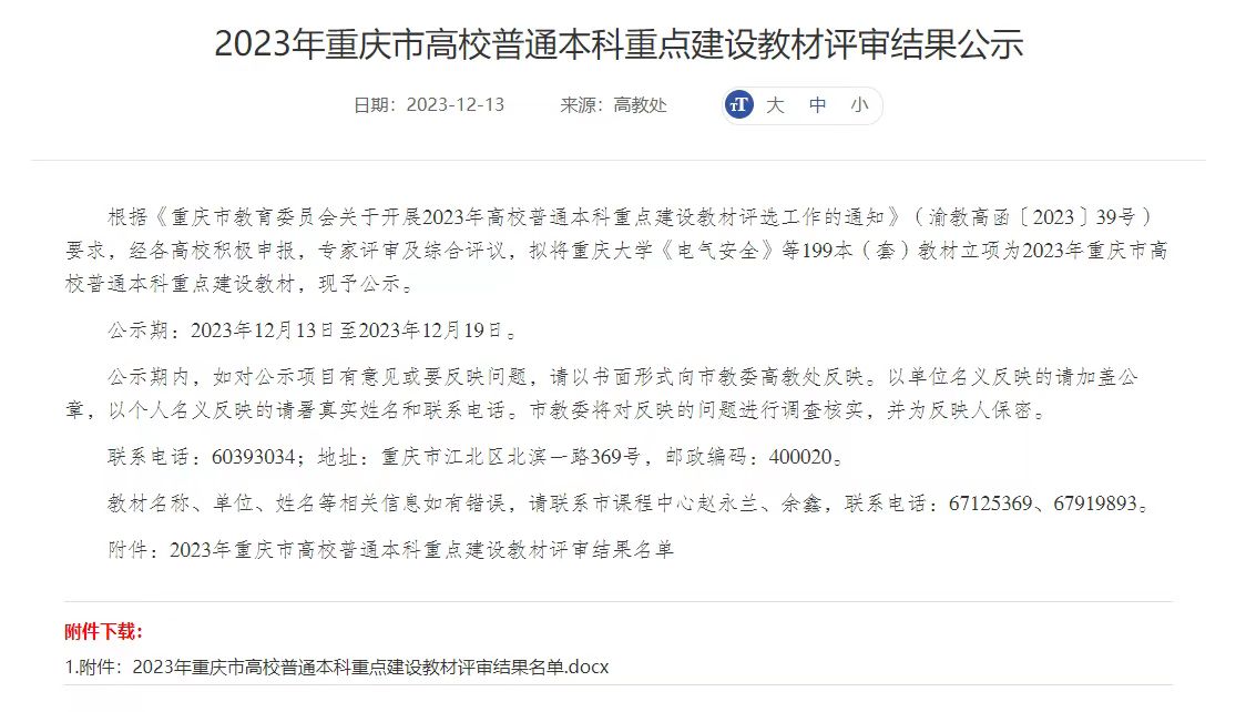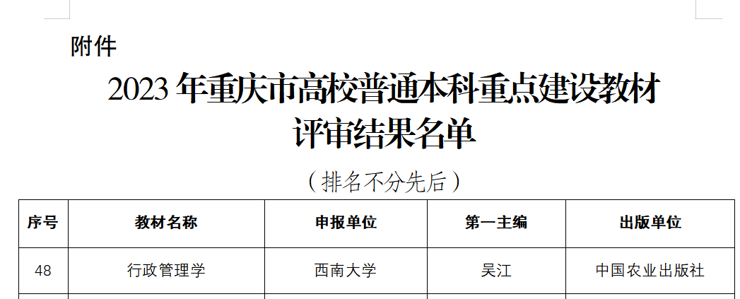 12月13日,重庆市教育委员会发布《2023年重庆市高校普通本科重点建设教材评审结果公示》,学院吴江教授主编的《行政管理学》教材获重庆市高校普通本科重点建设教材立项。
