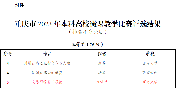 在学校教务处、教师发展中心的带领与支持下,学院高度重视,新文科教师发展分中心切实推进,我院哲学专业李章吕教授积极备赛,经学院推荐、校级初赛、市级复赛,获得“重庆市2023年本科高校微课教学比赛”三等奖。