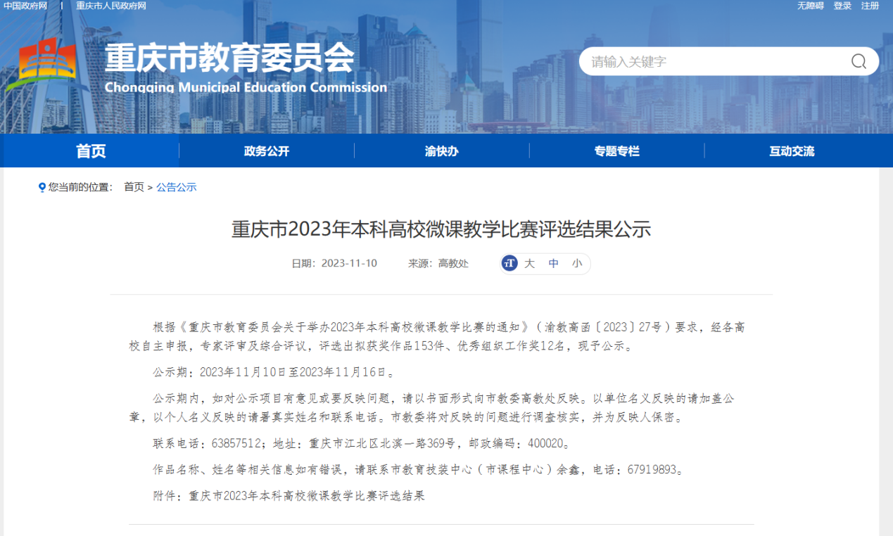 为深入贯彻习近平总书记关于教育的重要论述,落实教育数字化战略部署,充分利用信息技术开展人才培养模式和教学方法改革,进一步提升高校教师数字化教学能力,推动建设高质量教育体系,重庆市教育委员会组织开展了“重庆市2023年本科高校微课教学比赛”。