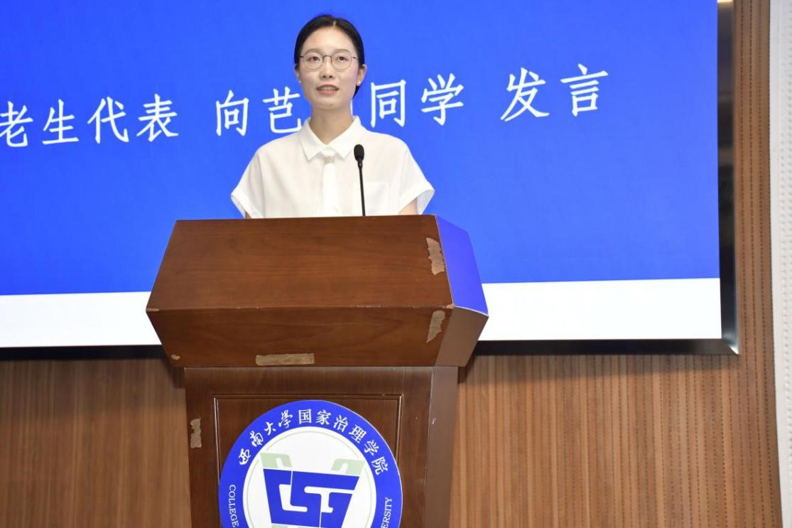 随后,老生代表2022级哲学系博士生向芑润同学发言。向芑润同学向新生们分享了生活、学习上的感受,希望新生们可以在这里修真才实学、增长才智;养家国情怀、勇于风险;养健康心态、充满勇气;筑健康体魄、保持活力。
