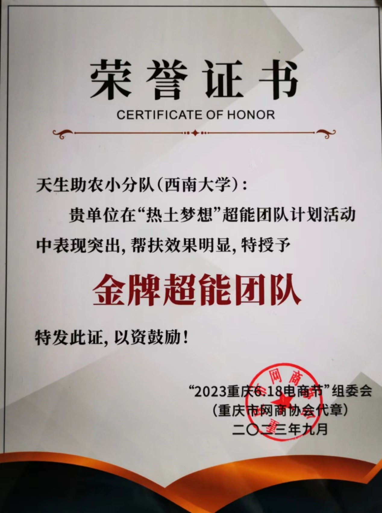 该计划是“2022重庆6.18电商节”电子商务助力乡村振兴活动的重要内容之一。学院组建的“天生助农小分队”经过激烈的角逐与热土心愿成功配对,成为50对梦想帮扶组合之一。经过一年对热土心愿的赋能帮扶工作的开展,天生助农小分队在9月14日的表彰活动中被授予“金牌超能团队”称号。据悉该称号共有8个团队获得。