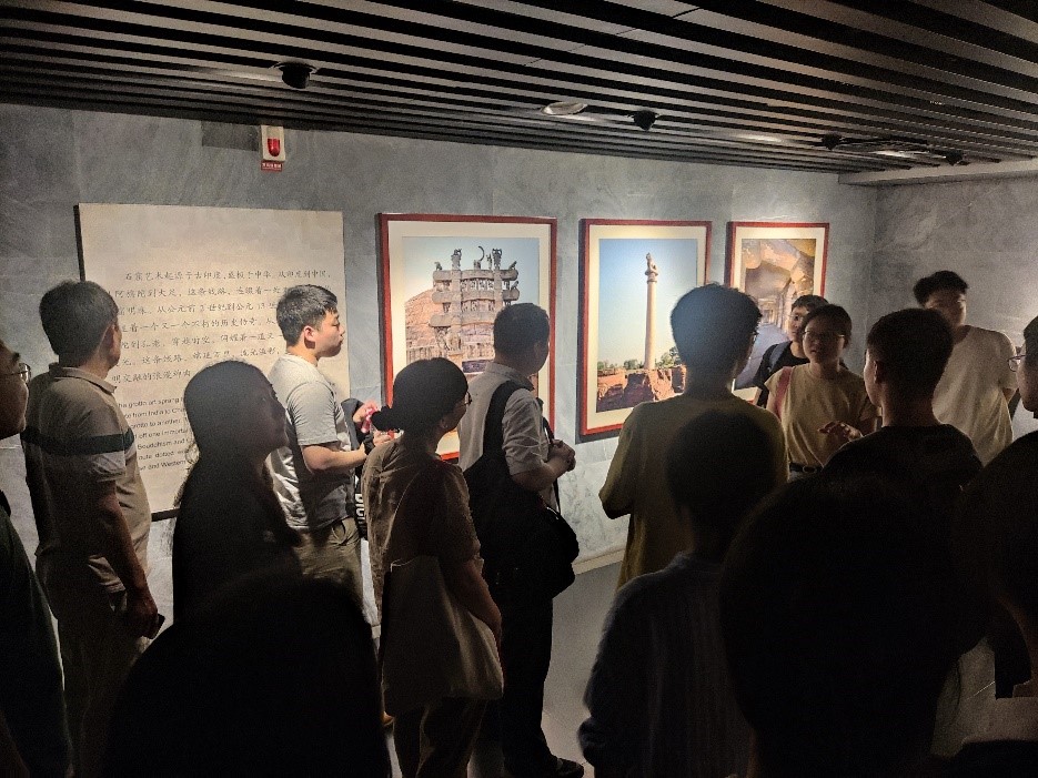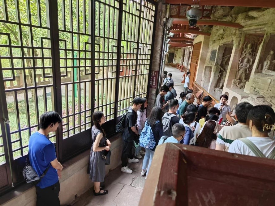 午餐后,师生们来到大足石刻博物馆。在讲解员的带领下,师生深入了解了全球主要石窟石刻的历史背景和文化内涵,同时加深了对大足石刻的了解。接着,师生们深入宝顶山石刻群。石刻的内容包括佛教的故事、神话传说、文化历史等各个方面,形象生动、构图精美,不仅独具艺术价值,也有很高的历史和文化价值。师生们通过亲身体验、观察和解读,学习了石刻中深刻的意义和历史背景。在北山石刻、宝顶山石刻群和南山石刻的游览中,师生们不仅欣赏到了石刻鬼斧神工的艺术之美,还深刻体悟到了中华文明的博大精深,感受到了人文与自然的和谐共存。