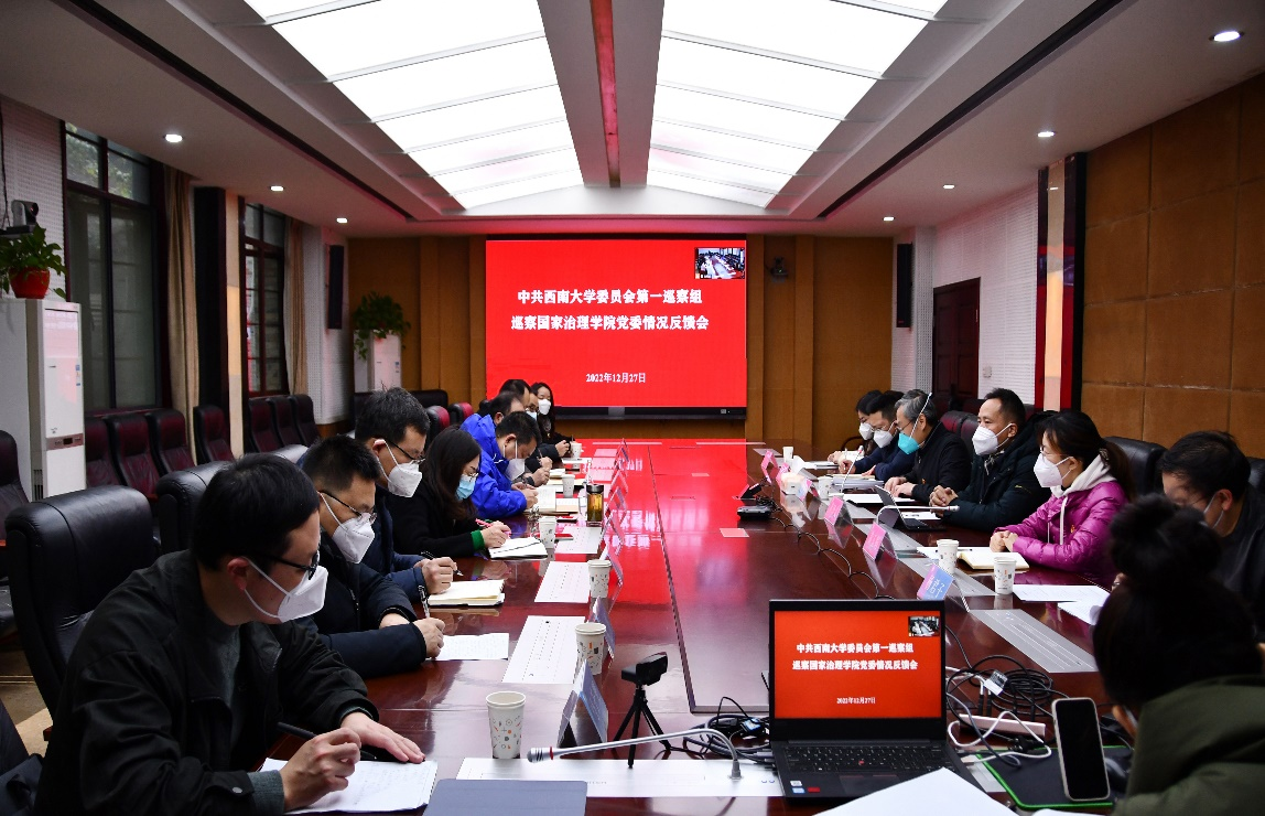 发布时间: 2022-12-27 14:45:24 已阅读:12月27日上午,西南大学党委第一巡察组巡察必赢线路检测中心党委情况反馈会在绩镛楼310会议室召开。学校党委副书记、巡察工作领导小组副组长安春元,第一巡察组组长、校纪委委员、心理学部党委书记黄泽文,校纪委副书记、党委巡察工作办公室主任刘勇,巡察组副组长、纪委办案件监督管理室主任、监察处副处长黄玉娟,巡察组副组长、宣传部副部长田丽,党委巡察工作办公室巡察事务科科长杨君子出席会议。会议由必赢线路检测中心党委副书记、院长潘孝富主持,必赢线路检测中心党委书记吴江作表态发言。
