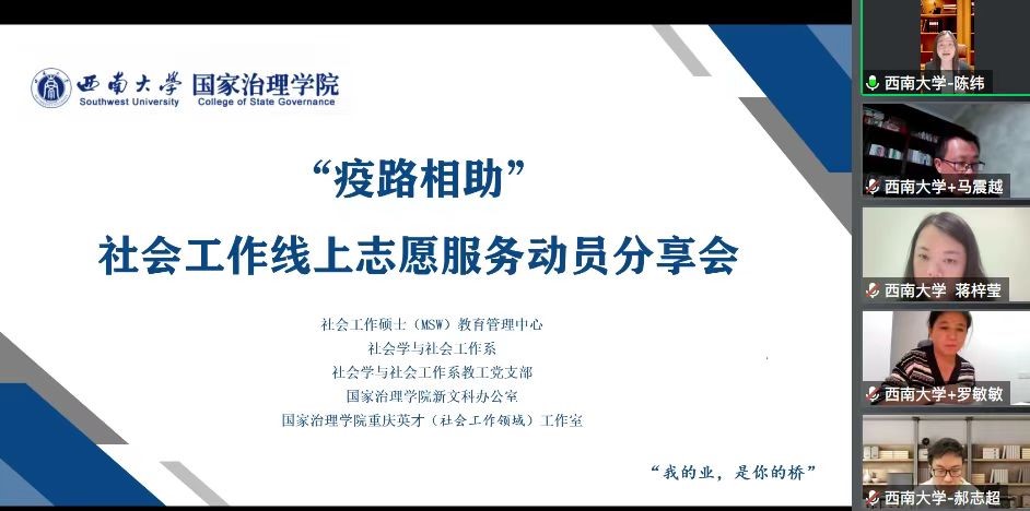 发布时间: 2022-11-22 22:15:08 已阅读:当前疫情形势严峻复杂,为更好回应居民需求,社会工作硕士(MSW)教育管理中心牵头,联合学院社会学与社会工作系教工党支部、新文科建设办公室、重庆英才(社会工作领域)工作室,于11月15日启动2022年“‘疫路相助’社会工作线上志愿服务”计划。积极与重庆各区县、各社工服务机构取得联络,召集社会工作专业志愿者,以专业优势协助社区防疫工作,为社区居民提供“云探访、云陪伴、云抗疫”线上关爱服务。