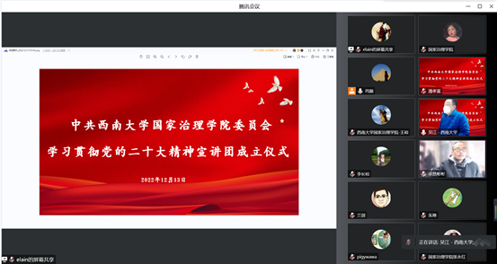 1213日下午,学院党委在“云端”举行学习贯彻党的二十大精神宣讲团成立仪式。学院党委委员、纪委委员、专家组成员参加会议,会议由学院党委书记吴江主持。
