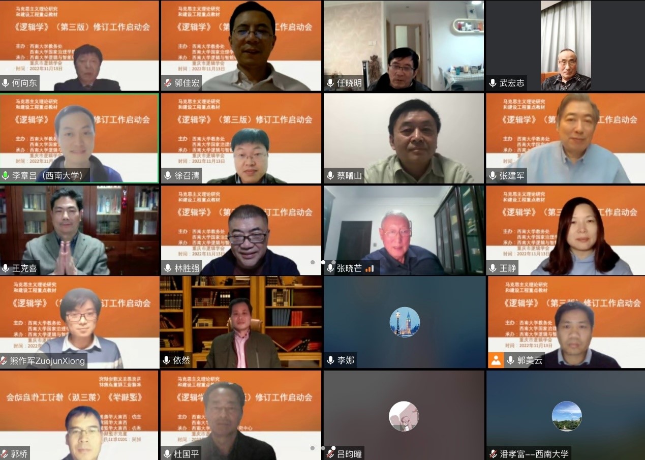 发布时间: 2022-11-18 19:41:42 已阅读:11月13日晚,马克思主义理论研究和建设工程重点教材(以下简称“马工程”教材)《逻辑学》(第三版)修订工作启动会以视频会议方式在云端举行。会议由西南大学教务处、必赢线路检测中心主办,西南大学逻辑与智能研究中心、重庆市逻辑学会承办。中国逻辑学会、西南大学教务处和必赢线路检测中心负责人,第三版修订组全体成员、高等教育出版社编辑等出席会议。会议由首席专家、教材主编、西南大学何向东教授主持。