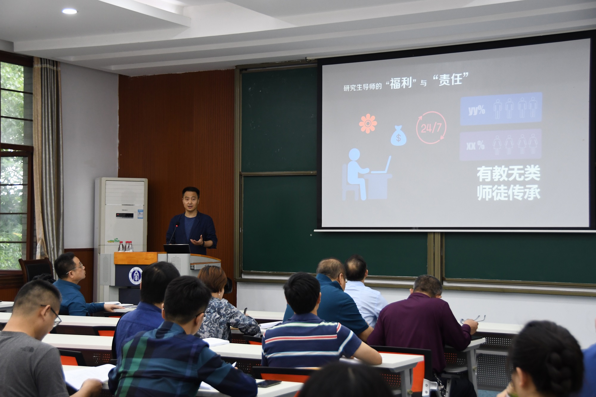 凃涛副院长首先对研究生导师的“福利”与“责任”进行分析,强调在当前背景下导师正确履行指导职责和谐师生关系的重要性,并就研究生培养新要求、研究生培养全环节以及导学能力技术赋能提出建议。在培养要求方面,他提出立德树人、服务需求、提高质量、追求卓越四点要求;在培养环节方面,他肯定了研究生教育高质量内涵发展的必然趋势,并且介绍了研究生培养全流程、研究生培养关键环节以及分流退出;在导学能力技术赋能方面,他就未来教育中的变与不变、技术赋能对教师职业的四大挑战进行了交流,强调了当我们未来面临着“动机鸿沟”时,拥有一个自我激励的决心,利用数字化工具去创作与合作学习的重要性。最后,他就研究生培养的技术、方法、思维提出愿景,提出要秉持研学育人,求真创新,德业并进,学行天下的培养理念协作同进。