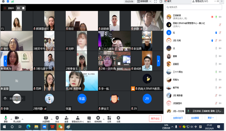 发布时间: 2022-06-13 14:55:16 已阅读:为强化对非全日制公共管理硕士的过程指导,保证学位论文质量,6月9日晚,学院在3201会议室召开了开西南大学MPA学位论文辅导与答疑会,郭美云副院长、MPA中心全体工作人员、指导教师、全体学生通过腾讯会议参加了本次会议。会议由张雪峰老师主持。