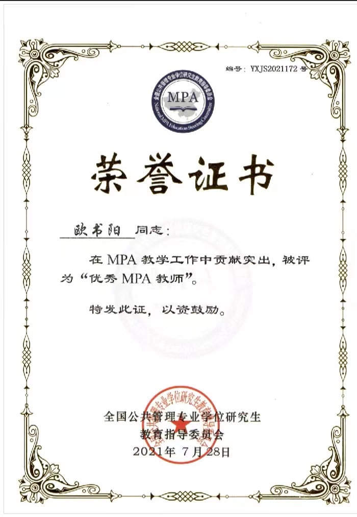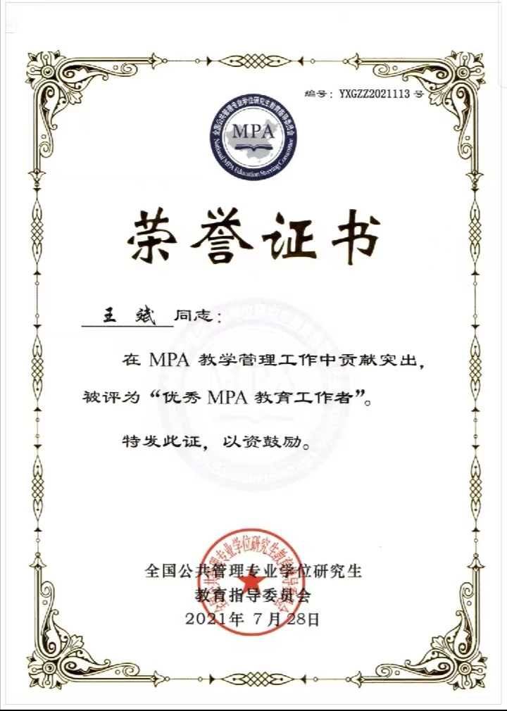 本次评选活动旨在表彰和奖励近年来在MPA教学和管理工作中做出突出贡献的个人,激励广大MPA教师做好本职工作,不断优化MPA师资队伍建设。本次获奖,是对两位教师教学水平和工作能力的高度认可,两位教师多年来致力于MPA教育工作,全面贯彻党的教育方针,落实立德树人根本任务,在MPA教学管理中积极探索MPA教育理念和发展特点,为我校MPA人才培养作出了突出贡献。