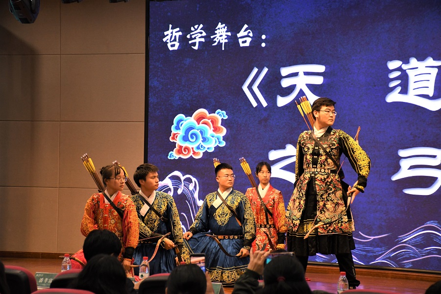 在哲学舞台环节,西南大学射艺协会带来了射艺表演《天道之弓》。表演用开弓的各种不同状态展现了“天道损有余而补不足”的哲学思想,启迪师生尊重自然规律,追寻心灵的充实和思想的丰富。