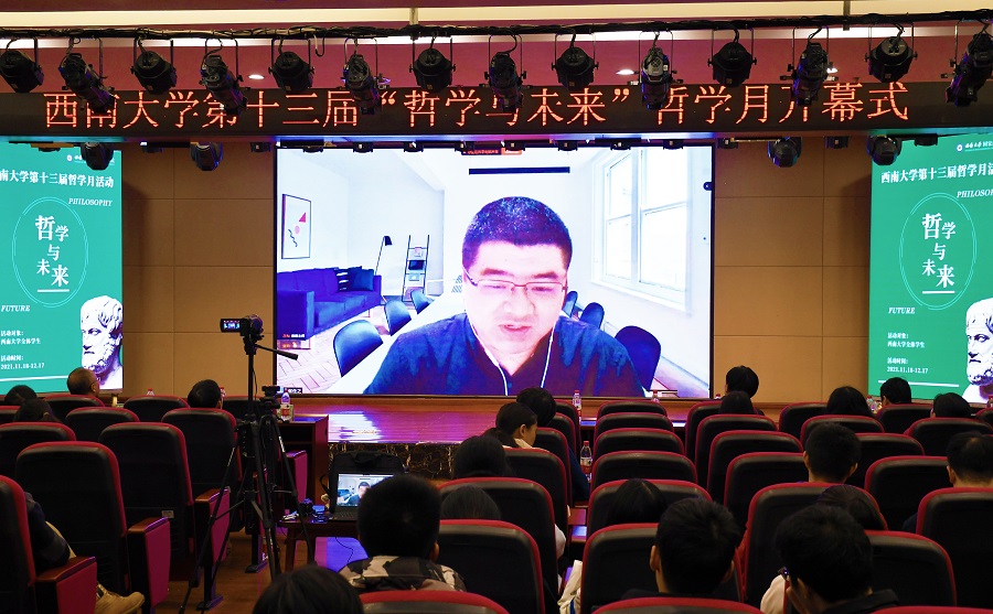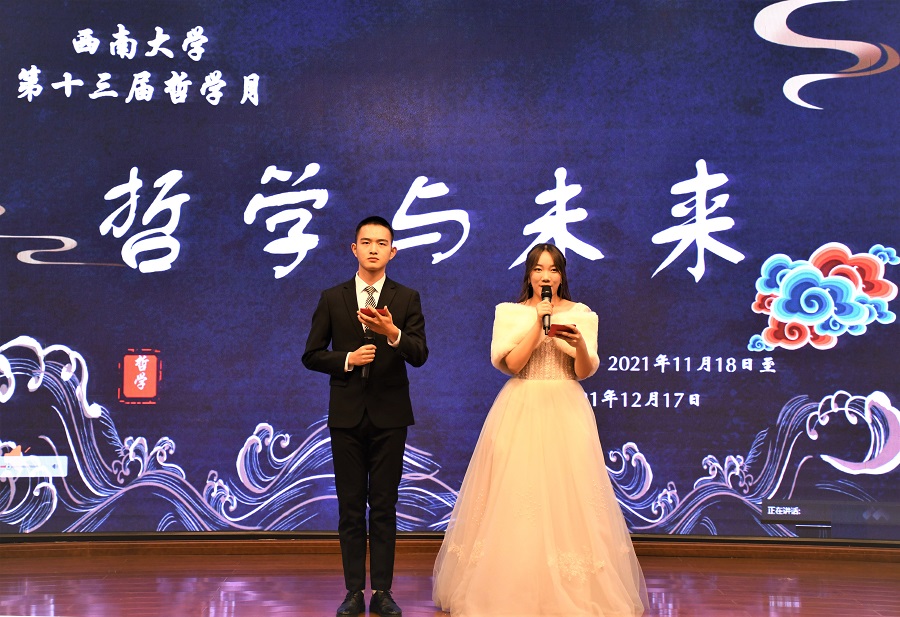 发布时间: 2021-11-22 17:21:42 已阅读:为促进广大师生加深对哲学知识、哲学学科的认知,感悟哲学魅力与内涵,庆祝“世界哲学日”,11月18日晚,“哲学与未来”——第十三届西南大学哲学月开幕式在校博物馆报告厅举行。学校副校长崔延强教授,中山大学哲学系主任张伟教授、社科处副处长徐中仁老师、学院院长潘孝富教授以及广大哲学爱好者共同出席了开幕式。