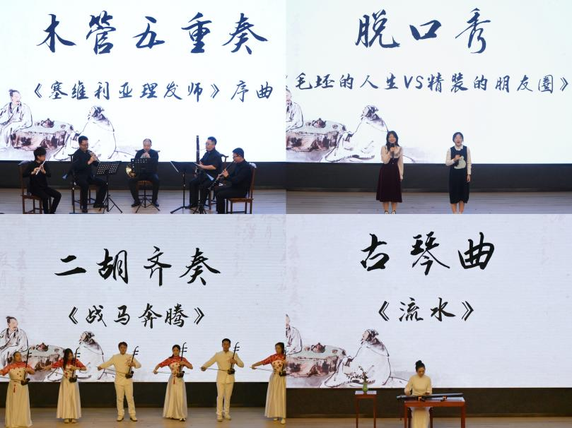 随后,来自音乐学院和必赢线路检测中心的师生展示了精彩的哲学舞台表演:木管五重奏《塞维利亚理发师》序曲在轻快优美的节奏中彰显了意大利人民追求解放、自由的个性;脱口秀《毛坯的人生VS的精装朋友圈》在幽默风趣的日常中体现关于人生的哲思;二胡齐奏《战马奔腾》表现了边疆骑兵英勇顽强、一往无前的战斗精神,绘形传神地把战马奔腾的形象如浮雕一般显现出来;古琴曲《流水》带领我们回到了伯牙子期的时代,时而浅如坠玉,时而亢似龙吟,时而清冷缠绵,时而澎湃浩荡。