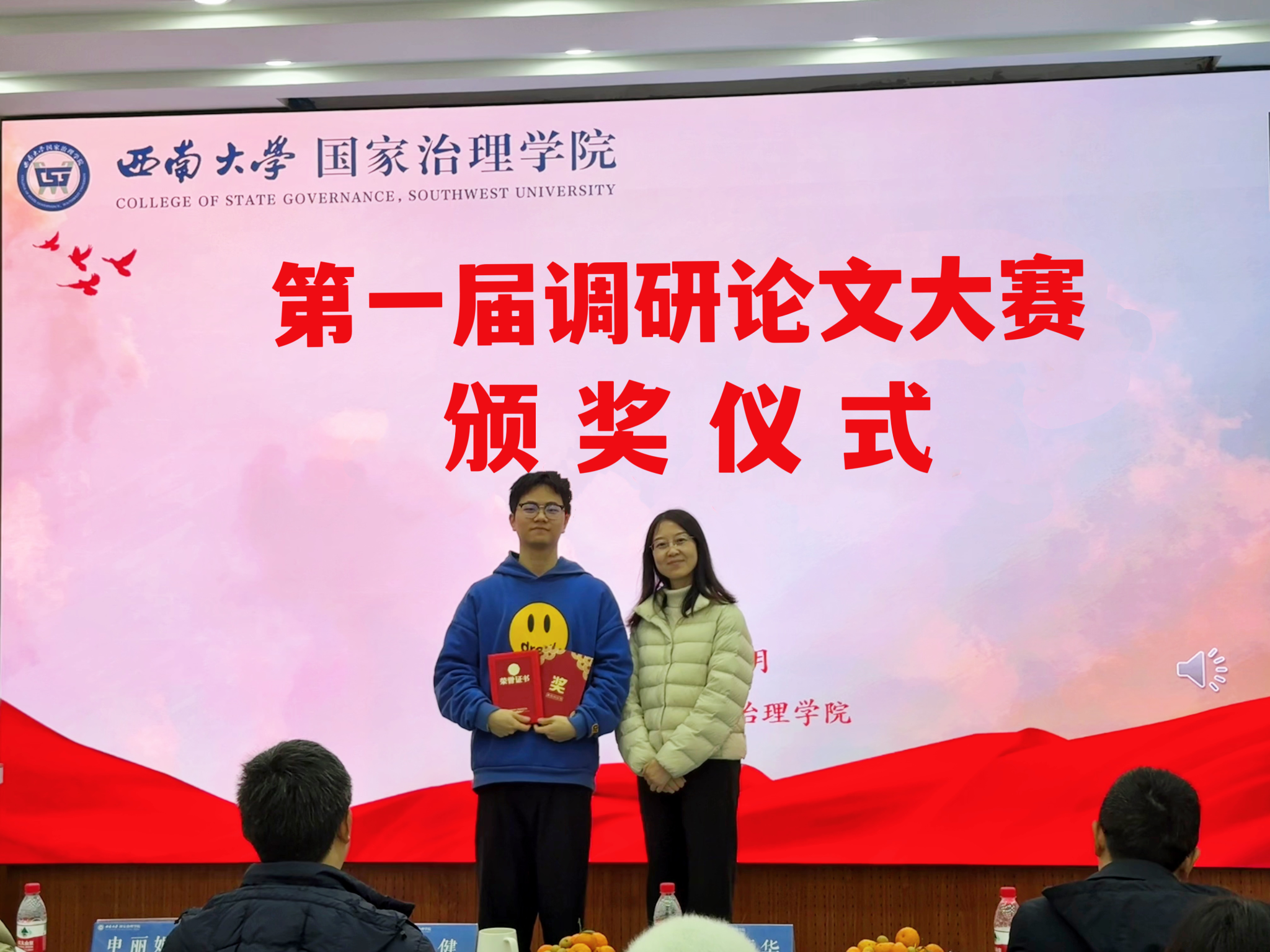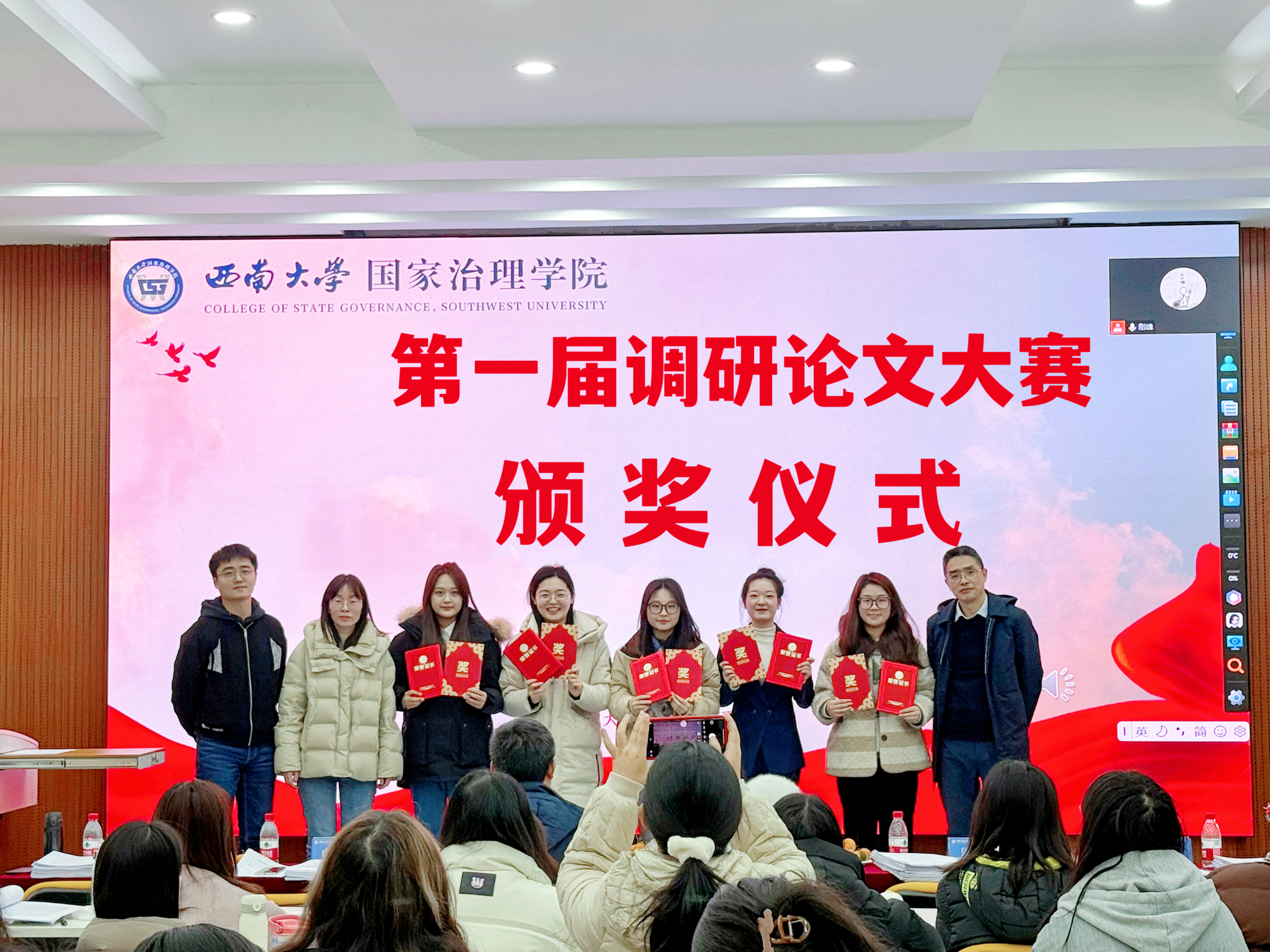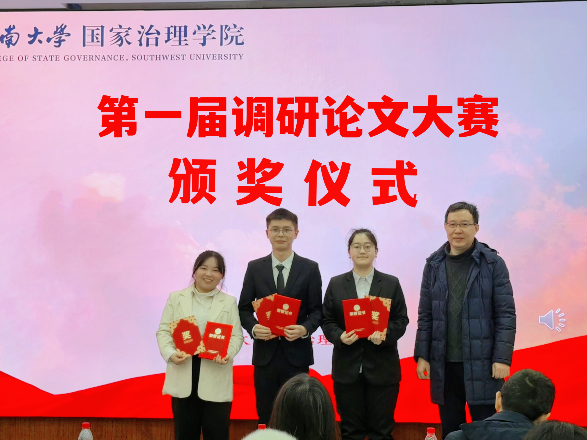 经过评委老师打分,陈丽华宣读了大赛获奖名单,乡村治理小队获得一等奖,旺旺队、银龄破“困”行动队、乡遇队获得二等奖,深藏blue队、我们天生一队、治理舰队、大学生厌学现象调研队、困境儿童需求分层分类调研小组、自成一队获得三等奖。