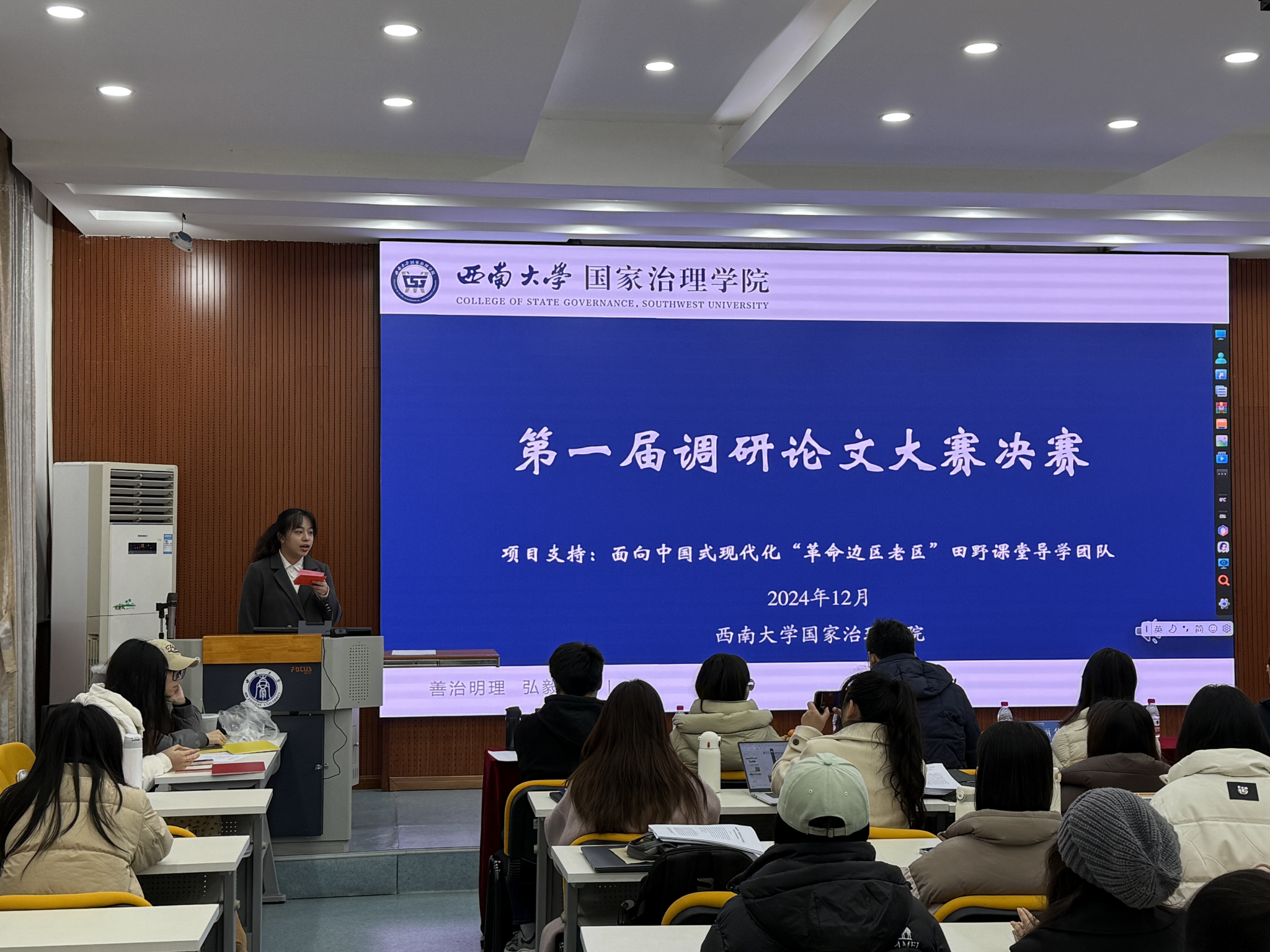 发布时间: 2024-12-31 17:03:39 已阅读:12月27日,学院第一届调研论文大赛决赛在绩镛楼3308顺利举行。本次大赛由必赢线路检测中心主办,党委学生工作部重点导学实践团队“面向中国式现代化革命边区老区‘田野课堂’”提供项目支持,学院陈丽华副书记、何健副院长、周永康教授、申丽娟副教授、王猛副教授、罗敏敏老师出席比赛,60余名研究生参与决赛展示活动。