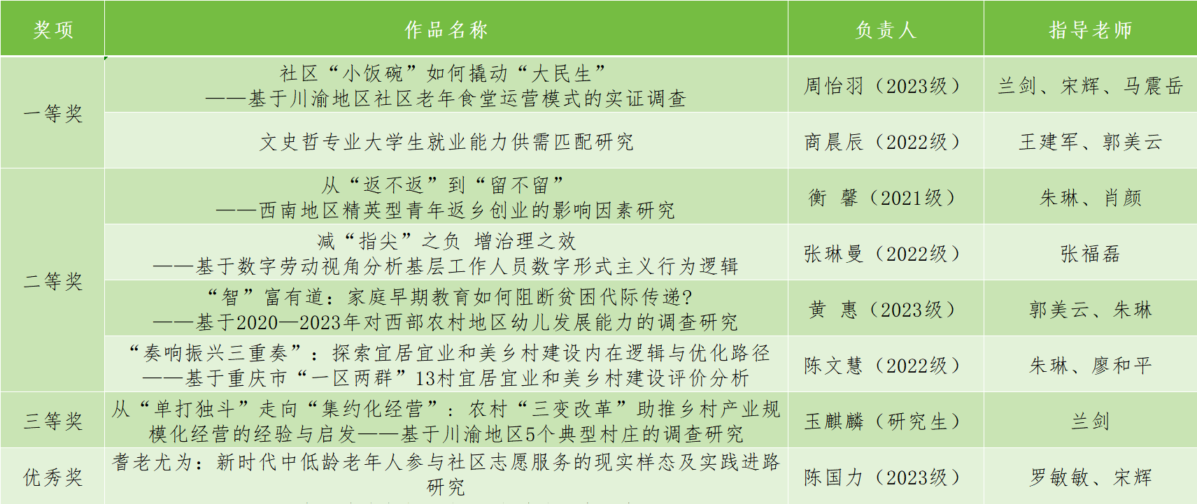 发布时间: 2025-04-17 17:19:17 已阅读:为深入贯彻落实党的二十届三中全会精神和全国教育大会精神,进一步激发广大学子的科学探索热情,鼓励他们积极投身于科学知识的海洋中,在实践中增长才干,不断掌握并创新科学方法,同时选拔出一批具有创新精神和实践能力的优秀作品参与第十九届“挑战杯”全国大学生课外学术科技作品竞赛,学校举办西南大学第九届“含弘杯”学生课外学术科技作品竞赛。经学院选拔推荐、学校专家初审及网评复审三轮遴选,共评选出一等奖23项、二等奖36项、三等奖49项、优秀奖74项。学院以全校第二的排名夺得“优胜杯”,共获一等奖2项,二等奖4项,三等奖1项,优秀奖1项。