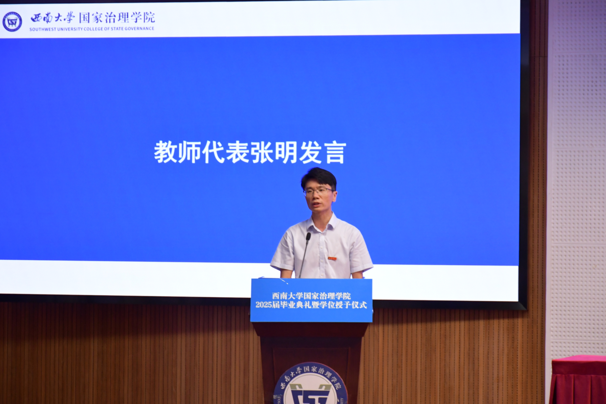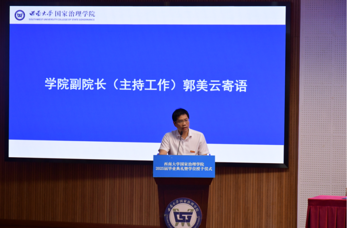 学院副院长(主持工作)郭美云代表学院全体教职员工向圆满完成学业的毕业生表示最热烈的祝贺,与毕业生一起回忆学院的蓬勃发展和同学们的蜕变成长,并寄语毕业生:敏于思,做新时代的追问者;立于行,做新时代的探索者;钝于外,做新时代的清醒者。祝愿毕业生们“心有所往,终至所归”,期待在西南大学建校一百二十周年和同学们再会。