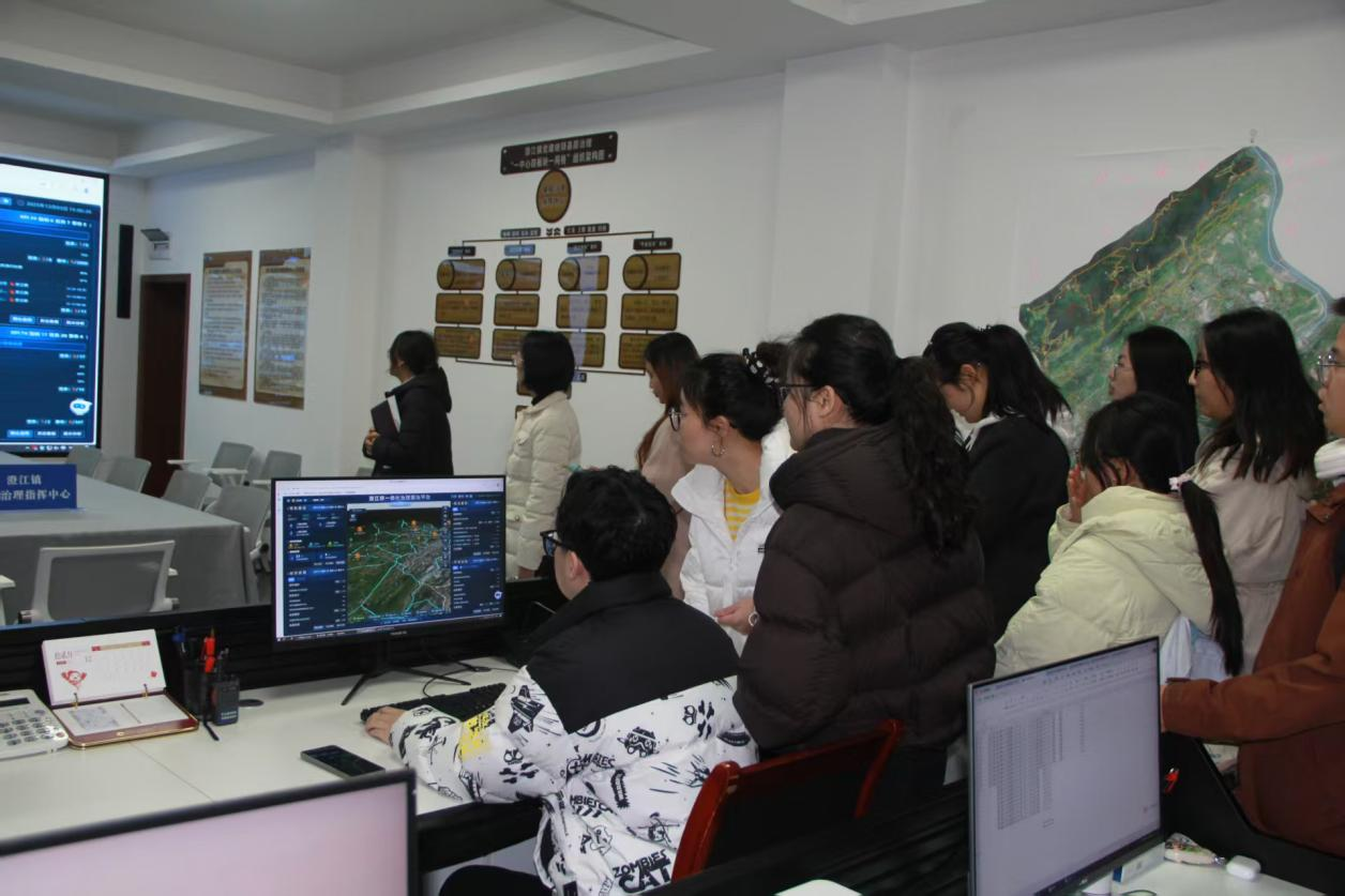 在澄江镇基层治理综合指挥中心,工作人员现场演示并详细介绍了澄江镇一体化治理智治平台。该平台以“渝快政”平台为基础,构建了“党的建设、民生服务、经济发展、平安法治”四大核心板块,整合智能监控系统与森林防灭火综合应用场景,深度融合数字化赋能理念,嵌入AI算法实现治理数据实时汇聚、风险精准预警、服务高效响应,让基层治理从“被动处置”向“主动预判”转变。师生们围绕平台运行逻辑、场景应用拓展、技术迭代优化等问题与工作人员深入交流,直观感受了数字技术为基层治理带来的效率革新。
