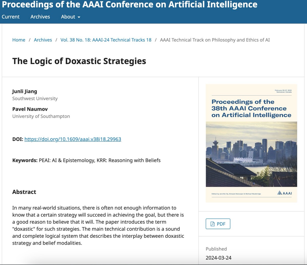 发布时间: 2024-04-01 10:33:27 已阅读:我院蒋军利老师合作撰写的论文《The Logic of Doxastic Strategies》入选国际人工智能顶级会议AAAI-24(Association for the Advance of Artificial Intelligence),近日论文已在线发表(https://doi.org/10.1609/aaai.v38i18.29963)。针对在许多现实情况下,通常没有足够的信息来知道某种策略是否会成功地实现目标,但有充分的理由相信它会成功。文章引入了术语“信念”来描述这种策略。主要技术贡献是给出了一个可靠且完全的逻辑系统,描述了信念策略和信念模式之间的相互作用。