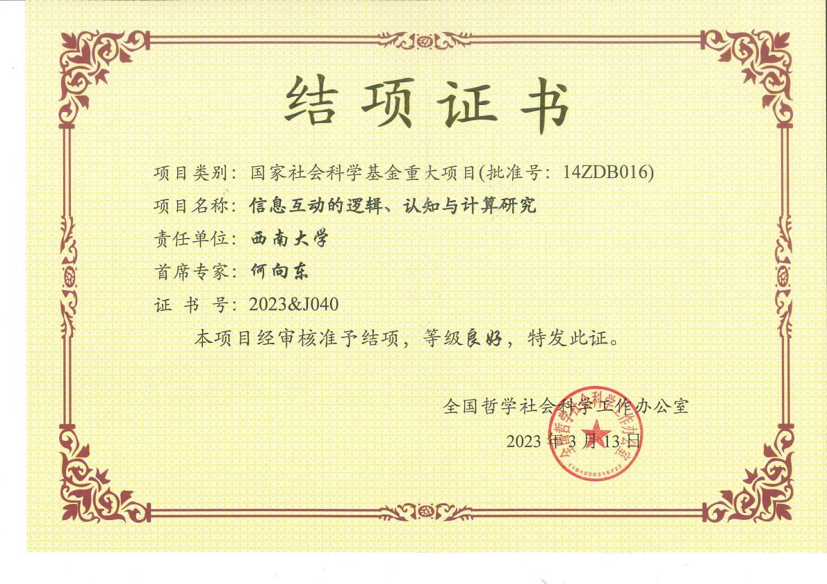 发布时间: 2023-09-09 11:26:09 已阅读:2023年3月,我院何向东教授主持的国家社科基金重大项目“信息互动的逻辑、认知与计算研究” (14ZDB016)顺利通过全国哲学社会科学规划办的结题验收,鉴定结论为“良好”,结项证书编号为2023&J040。项目的子课题负责人包括郭美云教授、陈武教授、雷旭教授和邓辉文教授。