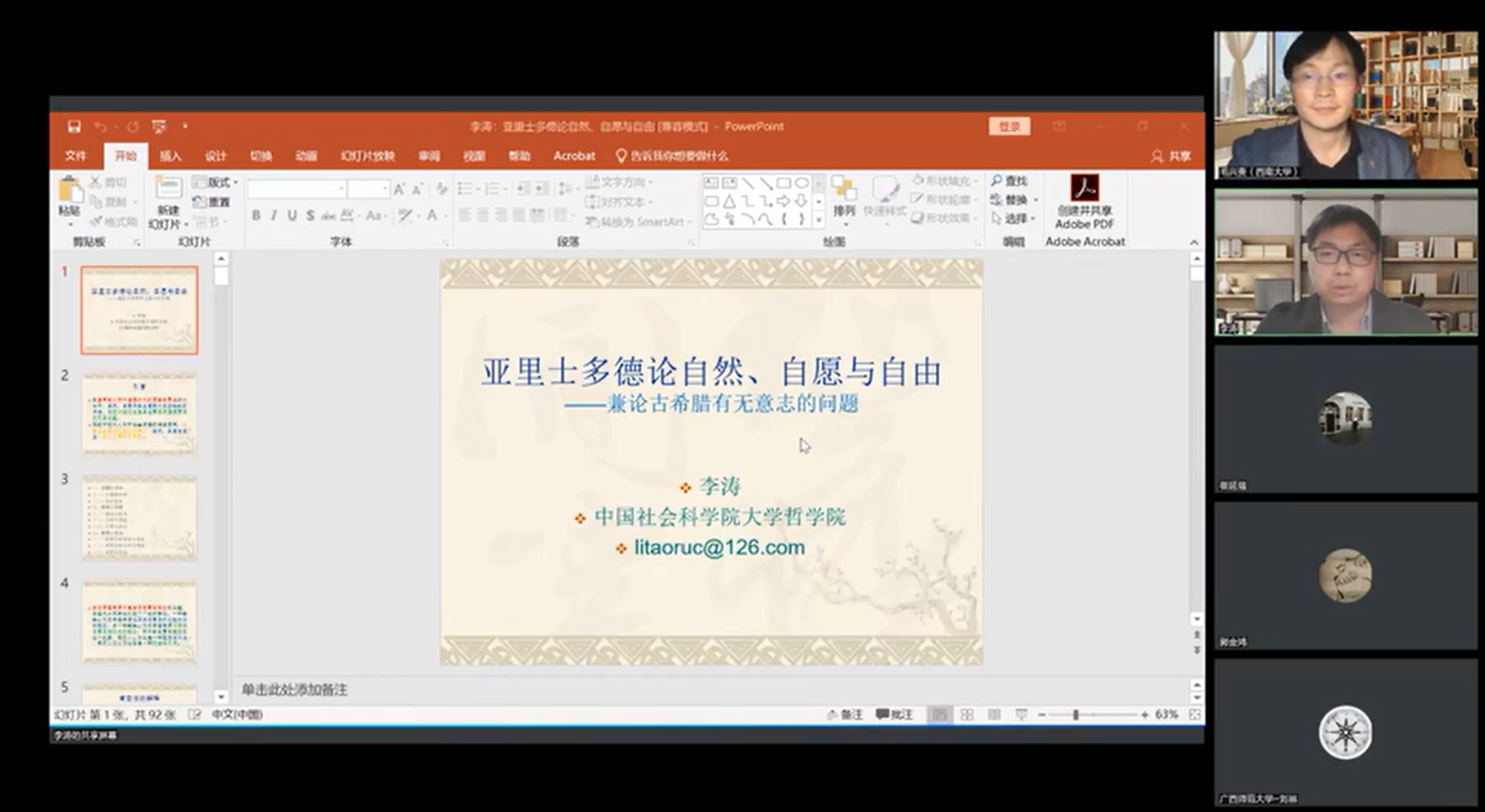 本次讲座邀请到中国社会科学院大学哲学院李涛副教授线上为师生做题为《亚里士多德论自然、自愿与自由——兼论古希腊有无意志的问题》的学术报告。讲座由西南大学必赢线路检测中心哲学系毛兴贵教授主持,西南大学副校长崔延强教授担任评论人。通过“腾讯会议”和bilibili平台共有来自全国高校的160余名师生参加本次讲座。