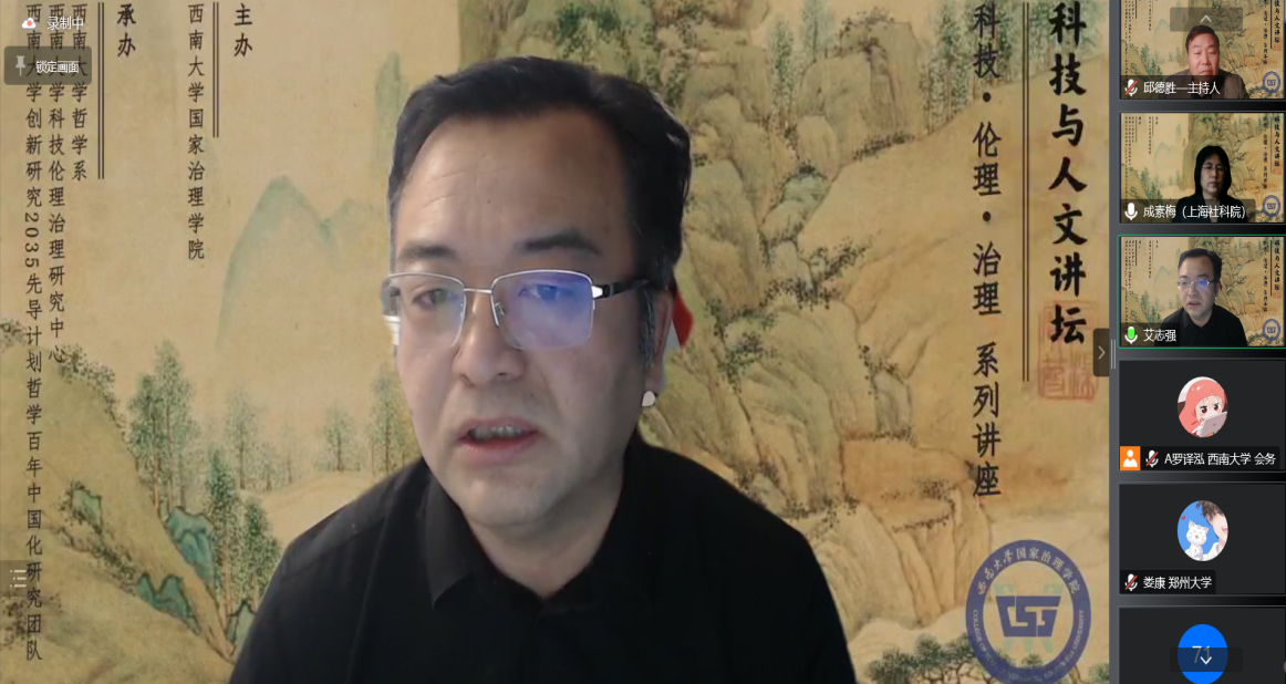 本次讲座有幸邀请到上海社科院哲学所副所长、《哲学分析》杂志执行主编成素梅教授做题为《智能革命引发的伦理挑战与风险》的学术报告。讲座由西南大学哲学系副主任邱德胜教授主持,辽宁工业大学马克思主义学院院长艾志强教授应邀担任评论人。邱德胜教授简略阐述了科技与人文讲坛的宗旨和设想,并对本次科技伦理治理系列讲座的六位主讲嘉宾做了简略介绍。讲座反响热烈,共有来自全国高校和科研院所的300余名专家学者通过“腾讯会议”参加了本次讲座。