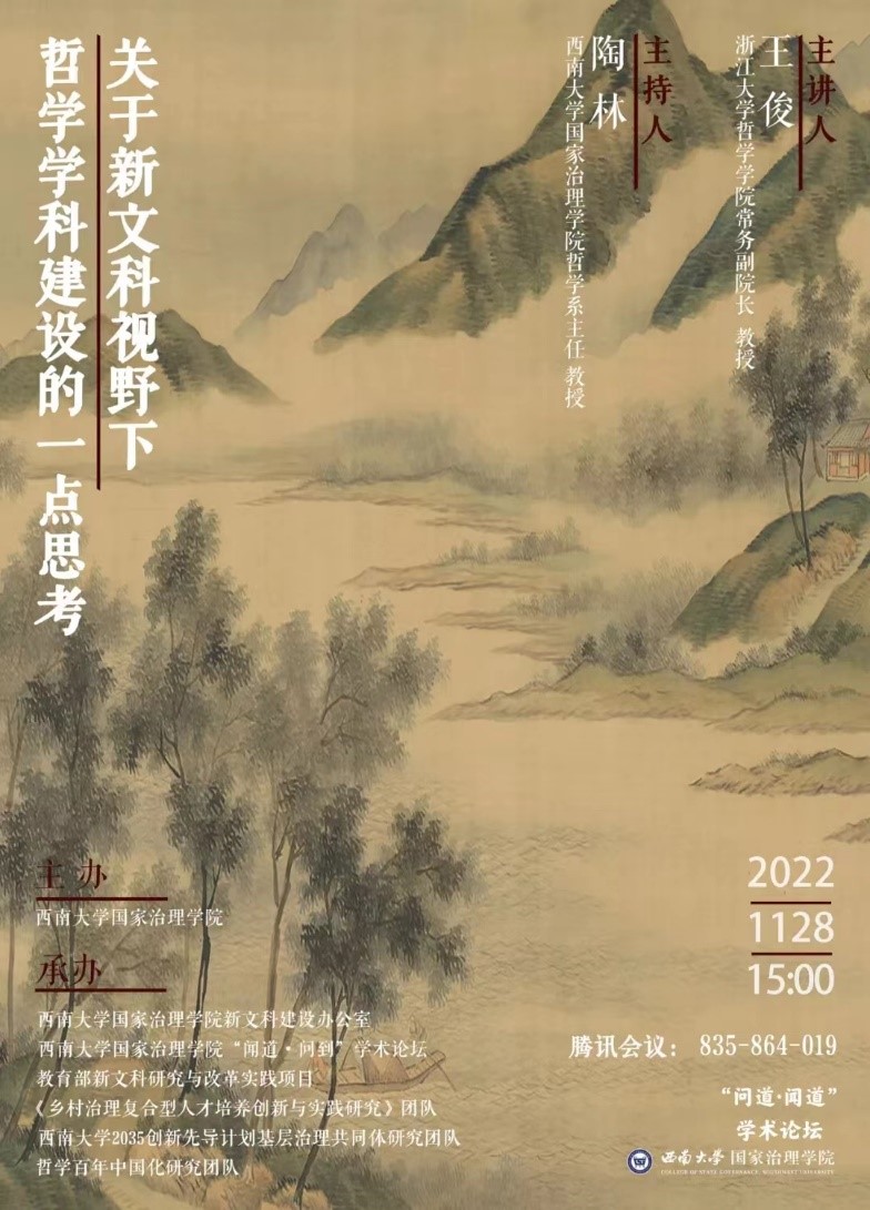 本次学术报告依托“问道·闻道”学术论坛,由学院新文科建设办公室主办,教育部新文科研究与改革实践项目“乡村治理复合型人才培养创新与实践研究”团队、西南大学创新研究2035先导计划“基层治理共同体研究”团队、“哲学百年中国化”团队等共同承办。