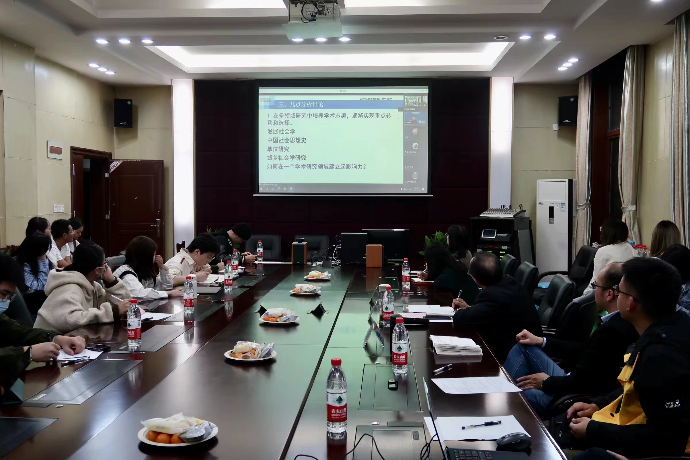2022年11月3日晚,“新文科”助力中国式现代化系列学术报告第一讲在绩镛楼3201会议室如期举行。吉林大学哲学社会学院院长田毅鹏教授在线作了题为《学术研究的领域选择与转换》的报告。本场学术报告由学院院长潘孝富主持,党委书记吴江致欢迎辞,副院长何健、新文科建设办公室主任兰剑及其他师生40余人在在线下参加,近200余人通过腾讯会议线上聆听。