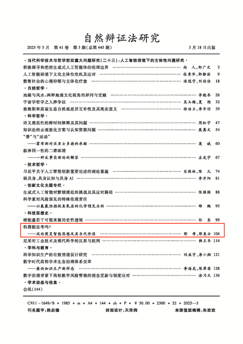 近日,我院哲学系郭美云教授与博士生郭希共同撰写的《机器能思考吗?——试论图灵智能思想及其当代价值》发表于《自然辩证法研究》2025年第3期。文章指出图灵机、图灵测试等著名概念及“机器能思考吗?”这一疑问是图灵对机器、大脑、计算与思维等问题进行深入观察与思考的理论体现,以极大的理论前瞻性和超越性回应了智能萌芽时代所需的思想启蒙。进而,通过总结概括图灵关于智能的相关论述,文章提出图灵智能思想这一重要概念,具体表现为以图灵机为代表的计算思想、图灵测试蕴含的智能标准思想与“图灵之问”体现的机器智能思想。最后,文章总结了图灵智能思想的当代价值,集中表现在奠定计算机科学的理论模型与数学基础,启发机器智能的理论探讨与实践进展,与推动人类智能和机器智能本质理解的哲学思考。