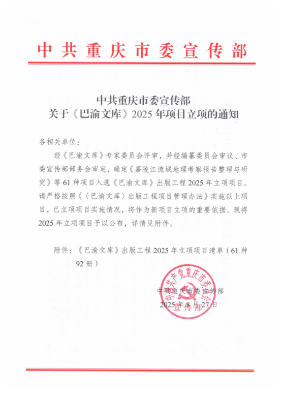 学术立院丨学院获批中共重庆市委宣传部《巴渝文库》研究项目暨重庆市社会科学规划特别委托项目资助2项