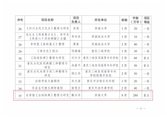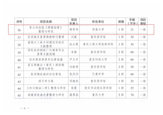 2025年8月,中共重庆市委宣传部公布了2025年度《巴渝文库》研究项目立项名单,学院解兴华老师主持“朱芾煌《法相辞典》整理与研究”重点项目及蒋军利老师主持“章士钊初版《逻辑指要》整理与研究”一般项目获得立项,并同时得到2025年度重庆市社会科学规划特别委托项目立项支持。