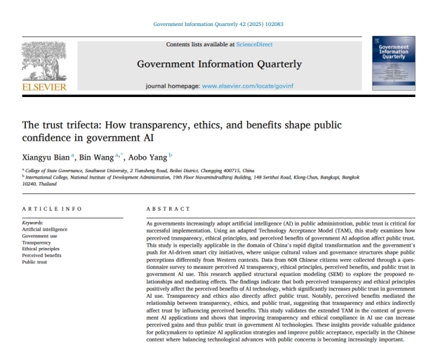 发布时间: 2025-10-16 10:58:36 已阅读:近日,学院哲学博士后流动站边翔宇博士研究团队在数字政府国际顶刊《Government Information Quarterly》发表题为《The trust trifecta: How transparency, ethics, and benefits shape public confidence in government AI》的研究论文。该研究聚焦政府人工智能应用中的公众信任问题。研究发现,透明度和伦理准则通过感知效益的影响显著提升公众对政府人工智能的信任,为优化数字政府人工智能应用策略、提高公众接受度提供了重要理论支撑和实践指导。