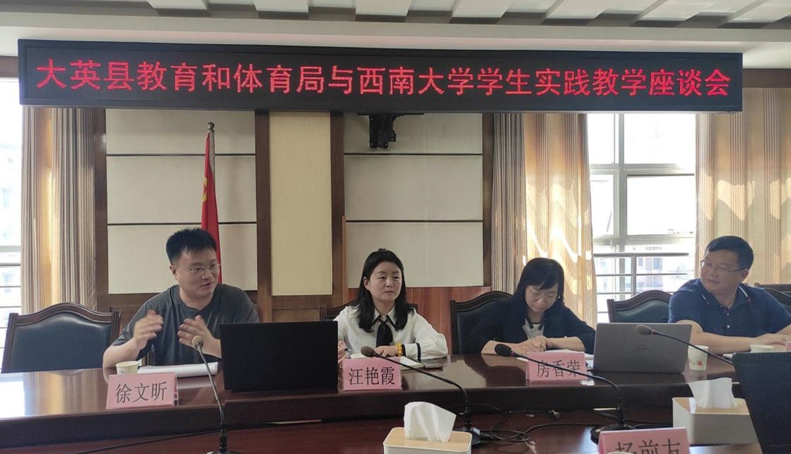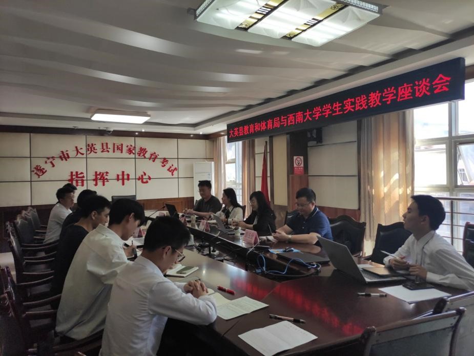 座谈会在大英县教育和体育局举行。座谈会上汪艳霞老师向大英县教体局相关负责人为学院学生提供优秀的实习平台表示感谢,对实习单位指导老师工作表示大力支持,希望实习单位指导老师能为学院的实践教学环节提出宝贵的意见和建议,表示学院将加强校地合作,共同促进人才培养质量提升。大英县教育体育局局长谢彦首先向学校和学院各位老师的到来表示热烈欢迎,对实习生工作取得的优异成绩和西南大学优秀的人才培养机制给予赞许,希望双方继续加强人才输送、培养的相关合作,保持密切的联系和沟通,为学生将来就业打下良好基础。学院2018级张洪川等赴大英实习小组成员向老师们汇报近一个月来的实习情况和心得与体会。参会老师对学生们在实习时期间锐意进取、踏实肯干的优异表现给予肯定和赞许,表示将尽己所能帮助实习同学解决工作与生活上遇到的困惑。