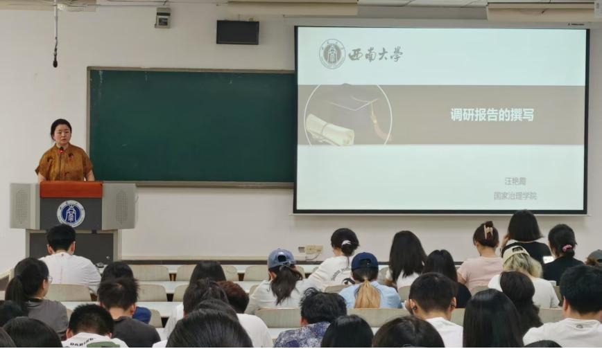 为培养学生写作能力和实践意识,助力学生更好完成专业实习任务,4月21日上午9:30,学院本科2022级于10教301教室开展了主题为“调研报告撰写”的实习前实务培训。本次培训邀请汪艳霞老师作为主讲人,2022级全体本科生参加培训。
