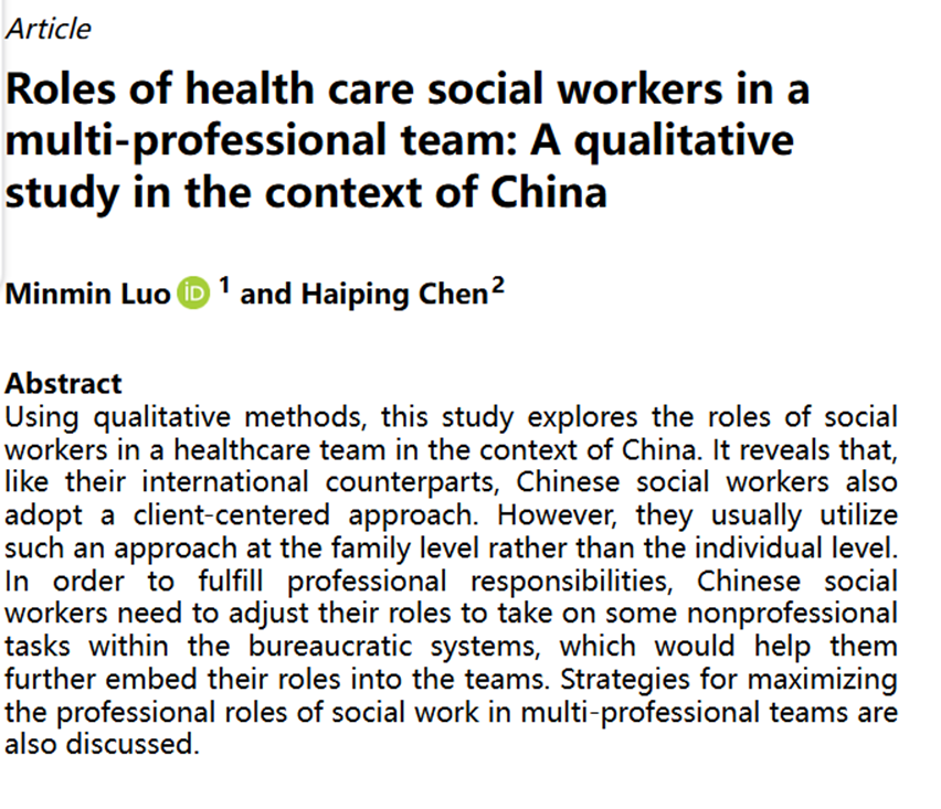 发布时间: 2025-02-28 17:46:37 已阅读:近日,学院社会学与社会工作系罗敏敏老师和北京大学社会学系陈海萍老师合作的全英文文章“Roles of health care social workers in a multi-professional team: A qualitative study in the context of China”(《健康照顾社会工作者在多专业团队中的角色:中国情境下的定性研究》)一文在世哲出版社(Sage)属下的《国际社会工作》(International Social Work)著名刊物在线首发。本研究采用定性方法,探讨了我国健康照顾多专业团队中社会工作者的专业角色。研究发现,与国际同行一样,我国的健康照顾社会工作者也以服务对象为中心,但他们更关注家庭层面而非个体层面。为了履行专业职责,中国社会工作者需要调整自身角色,在科层体制内承担一些非专业任务,这有助于他们进一步融入健康照顾多专业团队。文中还讨论了在健康照顾多专业团队中最大化社会工作专业角色的策略。
