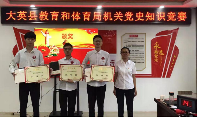 发布时间: 2021-06-29 11:27:31 已阅读:2021年6月25日上午,中共大英县教育和体局机关委员会在教体局五楼党员活动室组织举办“党史记心中,献礼100年”党史知识竞赛。本科2018级行政管理专业罗志豪、李兵兵、张洪川3位同志代表的赴大英实习临时党小组也参加了此次竞赛。