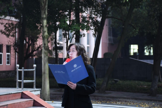 院党委副书记王晖老师作国旗下的讲话。王晖老师表示,作为与新时代同心同向的青春力量,希望大家把握好时代机遇,珍惜韶华,以不懈奋斗书写灿烂篇章。她代表学院对同学们提出期望:一是胸怀崇高理想,有家国情怀;二是把握时代潮流,有创新精神;三是汲取知识能量,有学习能力。她希望同学们以“修真才实学,养家国情怀”的学院精神为指引,摒弃浮躁,求真学问,求真理、悟道理、明事理,成为有理想、有情怀、有担当、有信仰,永远积极向上的国治青年。
