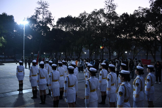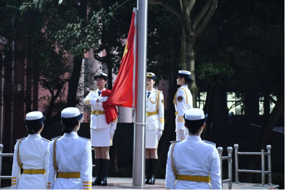春寒料峭,晨曦初现。清晨6时50分,全体同学已整齐地站立在大礼堂旁的国旗台广场等候,怀着激动的心情翘首以待升旗仪式的开始。6时55分,英姿飒爽的女子国旗班成员们护送着鲜艳的五星红旗入场,铿锵有力的正步足音激荡在同学们耳畔。7时整,升旗手、学院2020级何晏涵同学右臂一扬,鲜艳的五星红旗伴随庄严的《中华人民共和国国歌》缓缓升起,全体师生怀着激动的心情齐唱国歌,向着迎风飘扬的五星红旗行注目礼。