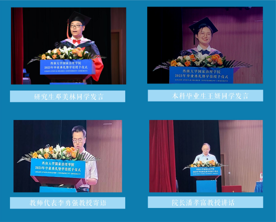 最后,院长潘孝富教授寄语,他代表全院师生员工向圆满完成学业的博士生、硕士生和本科生表示诚挚祝贺和祝愿,并寄语在场毕业生:格局决定品味;奋斗获得收获;实力赢得尊重。他祝愿毕业生们在星空之下,山海之间,向光而行,在新的征程上斗志昂扬、长风破浪,在青春的赛道上跑出佳绩!