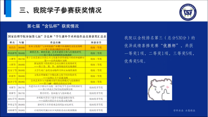 此次宣讲培训,加深了同学们对“含弘杯”学生课外学术科技作品赛事的了解,为有参赛意愿的同学提供了实用的信息和的建议,同时也激发了学生参与到学术科技竞赛的积极性和热情。