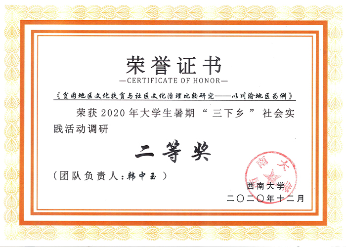 发布时间: 2021-03-26 22:37:09 已阅读:近日,西南大学2020年大学生暑期“三下乡”社会实践活动评审结果揭晓。西南大学学生公共政策宣讲团(以下简称“公宣团”)联合西南大学宣政在线网络文化工作站组织开展的《贫困地区文化扶贫与社区文化治理比较研究——以川渝地区为例》项目荣获二等奖,负责人韩中玉获评“优秀个人”称号。