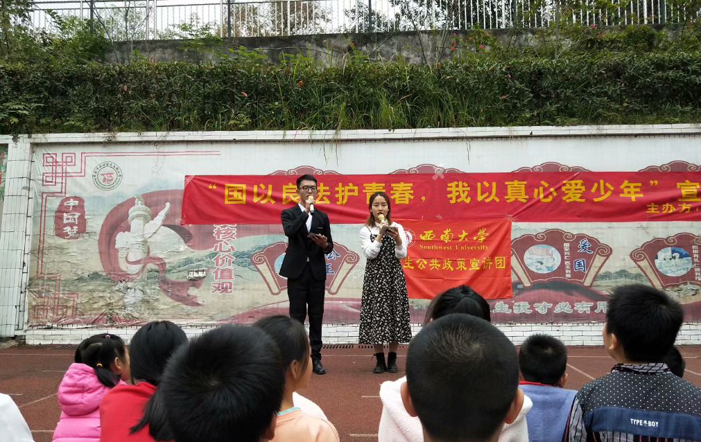 杲杲冬日光,明暖真可爱。随着信息化时代的发展,近年来越来越多未成年人伤害事件进入公众视野。为了提高公众对新修订未成年人保护法的理解,增强未成年人的自我保护意识以及运用法律的能力,西南大学学生公共政策宣讲团(以下简称“公宣团”)联合西南大学宣政在线网络文化工作站于2020年11月20日13:55在天生桥小学举办“国以良法护青春,我以真心爱少年”主题宣讲活动。在和煦的冬日暖阳下,主持人雷晓妍、万庆丰向天生桥小学的小朋友们详细介绍了本次活动的背景、目的并随后宣布本次活动正式开始。