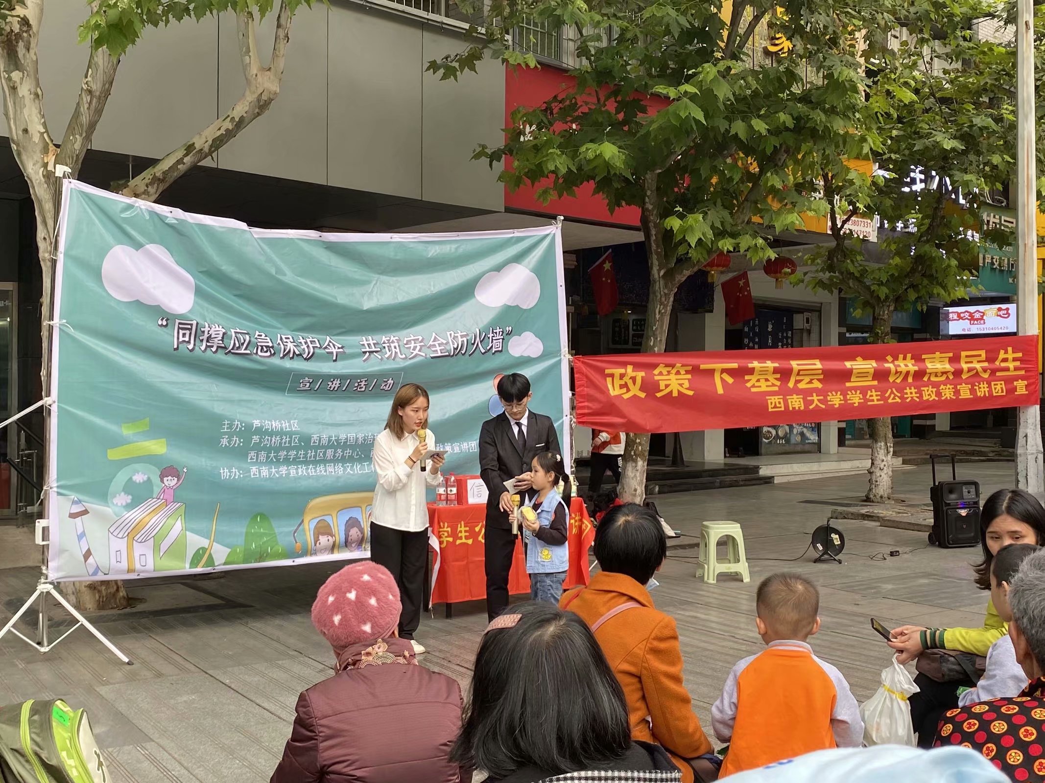 发布时间: 2020-11-04 08:23:45 已阅读:“凛冬散尽,星河长明。”随着国内疫情形势的逐渐好转,我们的生活也逐渐步入正轨,为了宣传我国在疫情期间应急管理工作上所取得的成就和经验,提高大众对于我国应急管理体系的理解,西南大学学生公共政策宣讲团(以下简称“公宣团”)联合芦沟桥社区于2020年10月23日15:30在芦沟桥社区举办“同撑应急保护伞,共筑安全防火墙”主题宣讲活动。在和煦的秋日暖阳下,雷晓妍和向昶两位主持人为我们详细介绍了本次活动的背景,激情澎湃的语言吸引了许多热心市民围观。
