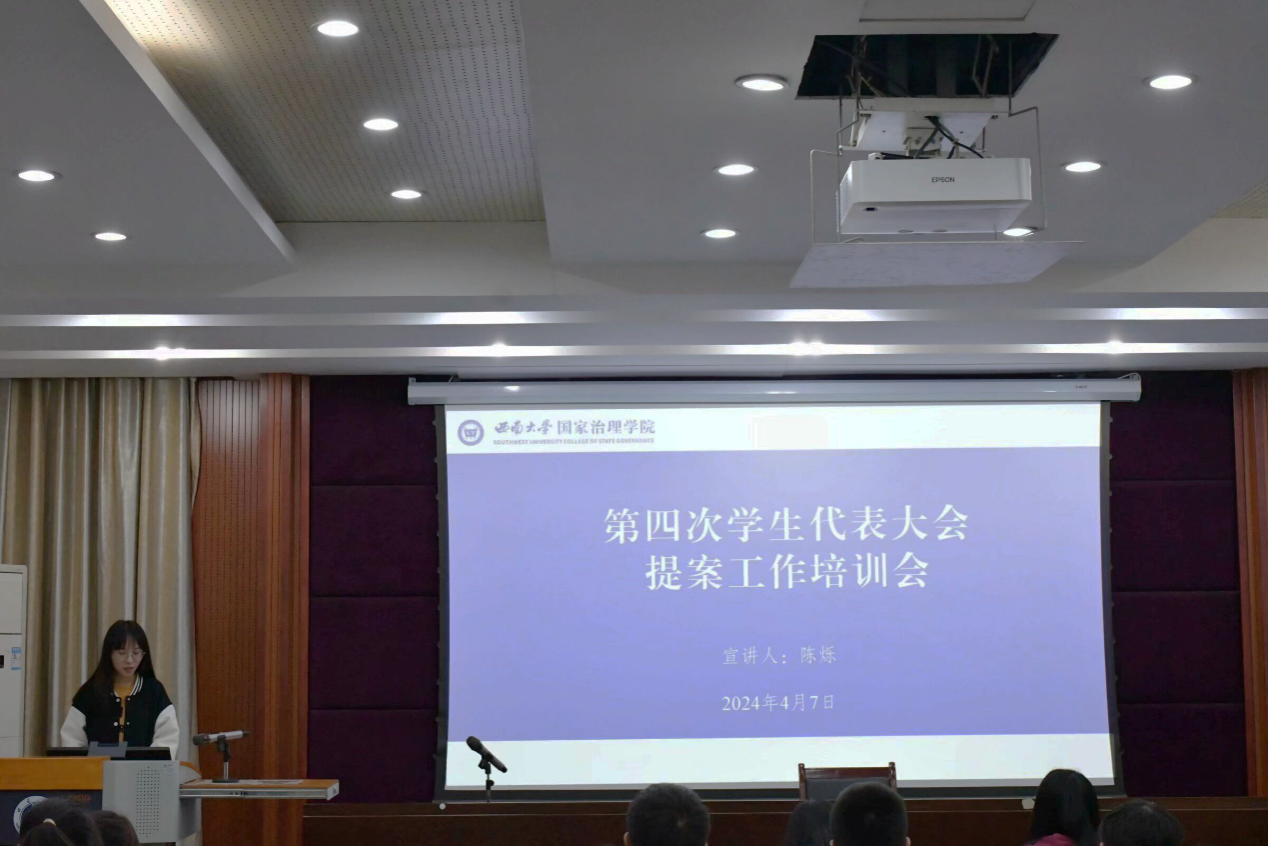 陈烁讲解了学生代表大会的组织原则、职能和重要意义,强调学生代表大会是同学依法依规行使民主权利、参与学校治理的机构,同时是学校联系广大同学的桥梁和纽带。其次陈烁阐述了提案的定义和特点,对提案一事一议的原则进行了解读,对标文件明确提案应围绕教育教学、成长成才、生活服务、权益维护、有关学院和学生发展的其他意见和建议五方面提出,同时明确了不予立案的四种情况。