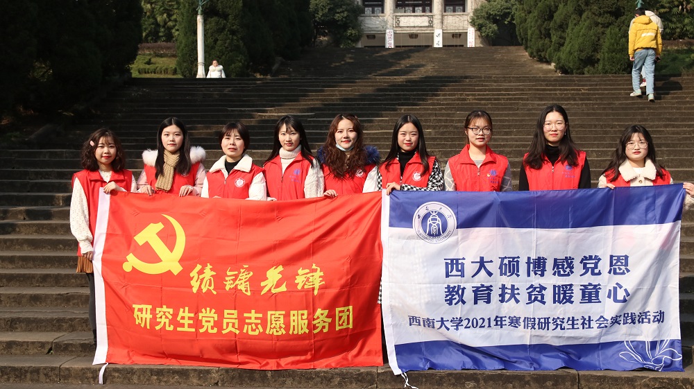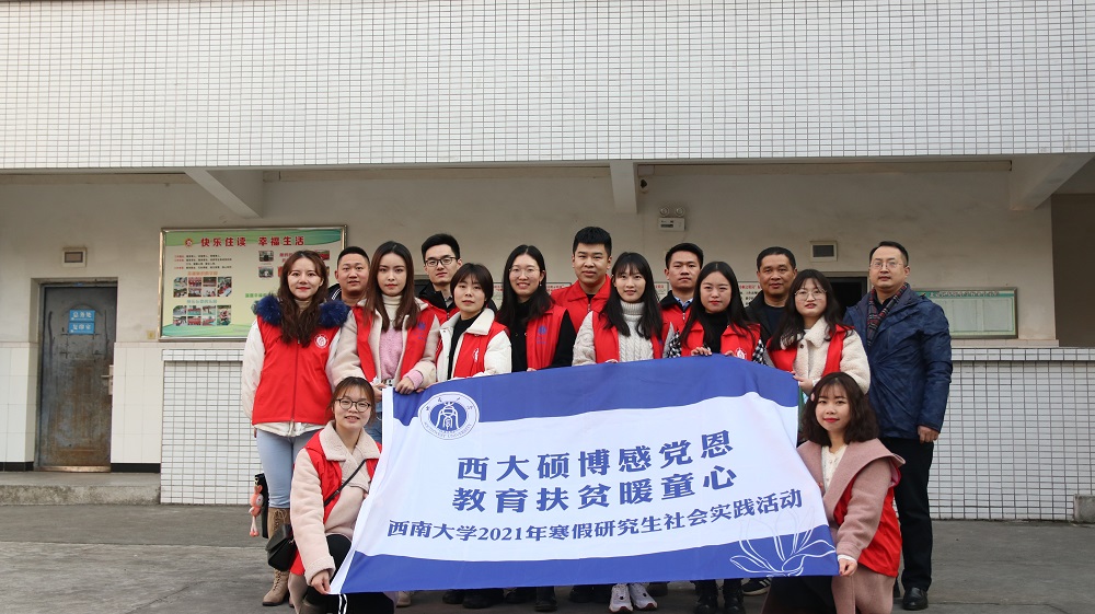 发布时间: 2021-01-26 17:09:38 已阅读:西大硕博感党恩,教育扶贫暖人心。为引导研究生立足国情,扎根大地,奉献社会,助人自助,传承百年初心,做好党的代言人,成为人民群众的好帮手,1月13日至17日学院“绩镛先锋”研究生党员志愿服务团组织社会工作、行政管理等专业的研究生,努力发挥专业优势,助力乡村教育振兴,前往北碚区东阳小学,化身园丁,执教杏坛,开展系列暖童心、筑童梦的志愿服务活动。