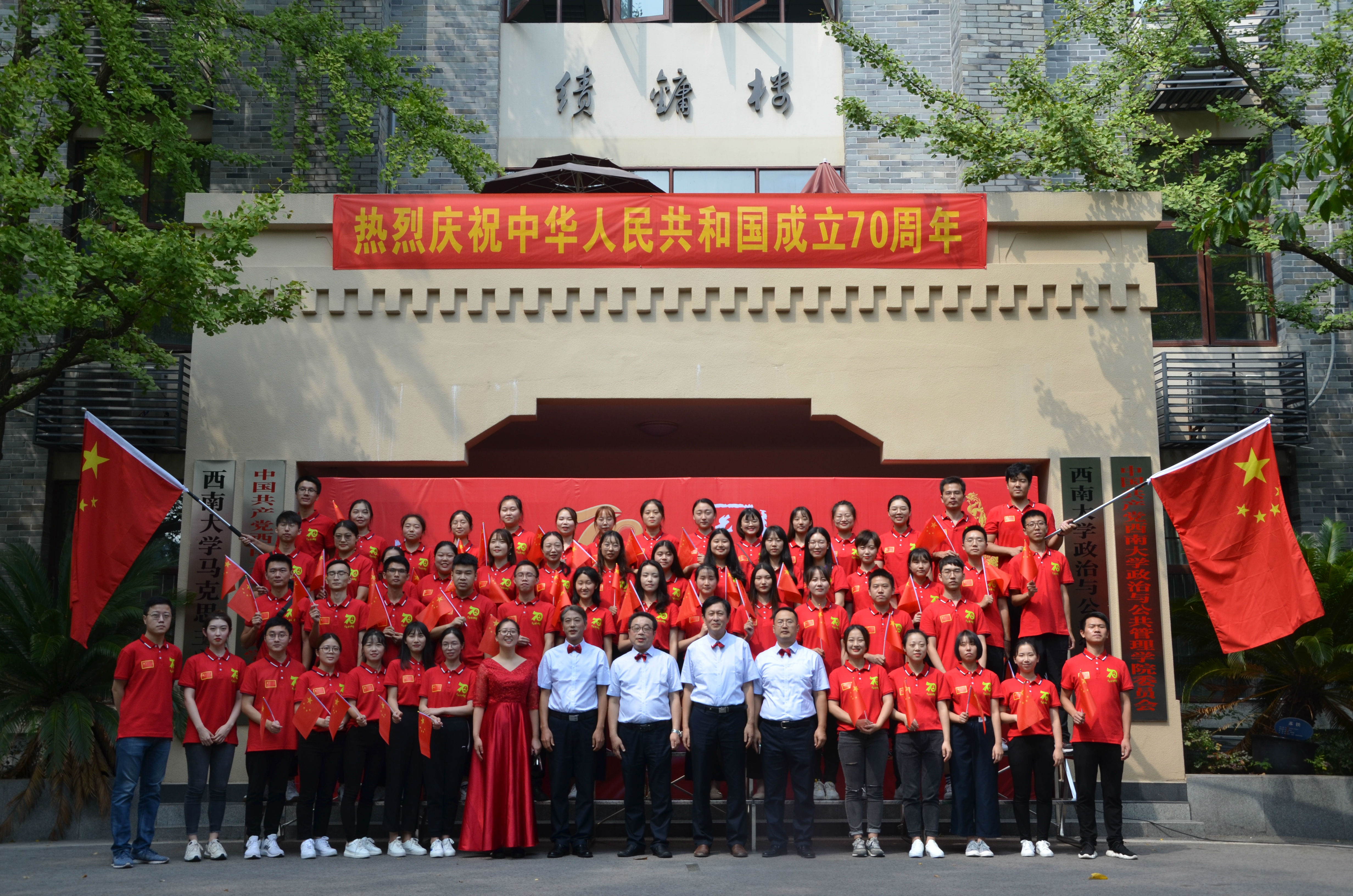 汇演分为三个篇章,依次为《我爱你中国》,《春天的故事》,《我和我的祖国》。“我要把最美的歌儿献给你,我的母亲,我的祖国......”,活动在《我爱你,中国》的深情演唱中拉开序幕。学院党委书记、院长吴江老师带领部分研究生导师、支部书记、青年教师,激情领颂《可爱的祖国》(方志敏),全场师生一起讴歌中国共产党的革命初心,描绘祖国美好幸福的景象,撼人心魄,昂扬自信,感染和激励着现场的每一位同学。2019级哲学系、政治系、公管系的研究生分别带来了诗歌朗诵《我爱你,祖国》、《中国,我的中国》、《透过历史的眼眸》,歌曲《春天的故事》、《幸福新起点》等,青砖红窗,衫白裙长,同学们以嘹亮之音表白爱国深情,以青春之我书就时代故事,礼赞中华人民共和国成立70年来的光辉历程,讴歌新时代的伟大成就,青春我辈,颂歌祖国,展现了新时代青年的新鲜活力、自信从容。最后,汇演在学院全体教职工的合唱《我和我的祖国》中结束,至此全场一个声音响彻绩镛楼,响彻西南大学,“我爱你,祖国!”