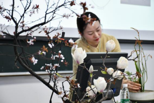 “阳春三月初,满枝迎春新花栖木。”随着主持人的开场致词,本次中国传统插花艺术赏析与实操课正式开始。王晖老师首先对苏苏老师的到来表示热烈欢迎,并向同学们介绍了我国传统插花艺术,希望同学们通过本次插花美学课堂感受到插花艺术的魅力,陶冶情操,提升人文素养,传承和弘扬我国优秀传统文化。