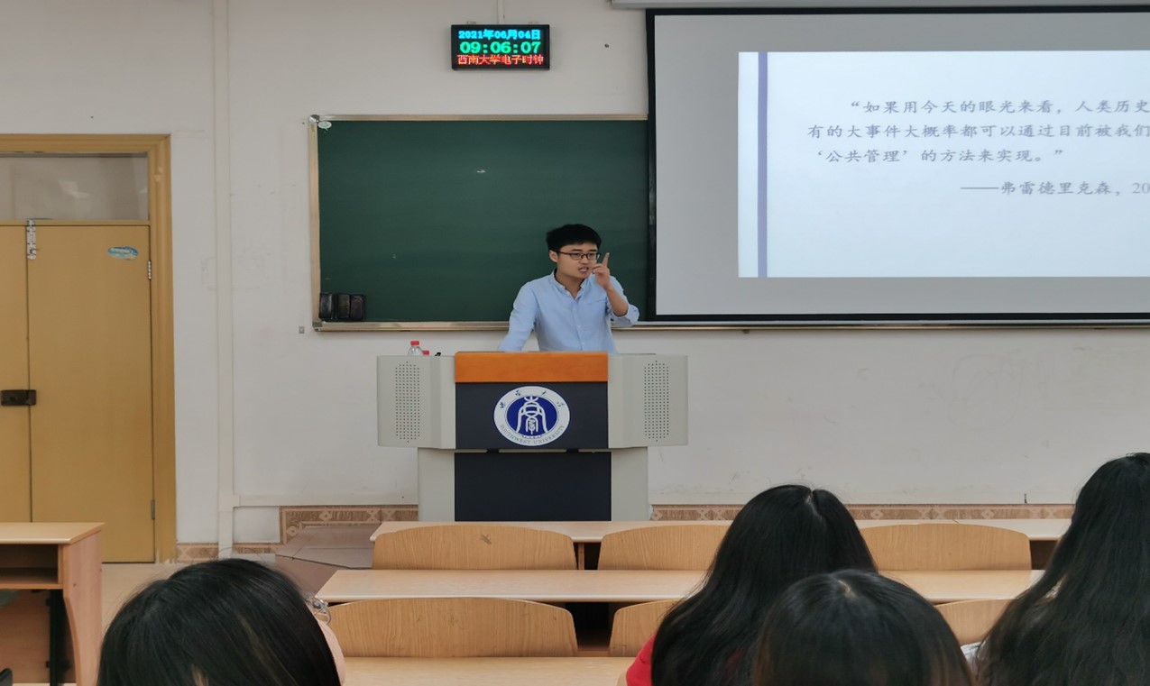 发布时间: 2021-06-07 15:34:36 已阅读:为加强对本科生的学术科研引导,提高学生的学术研究能力,6月4号上午,第五期行知沙龙在西南大学第八教学楼305举行。本期沙龙邀请到学院公共管理系副教授王猛作“走进公共行政的世界”的主题讲座,学院50名同学参加了此次沙龙。